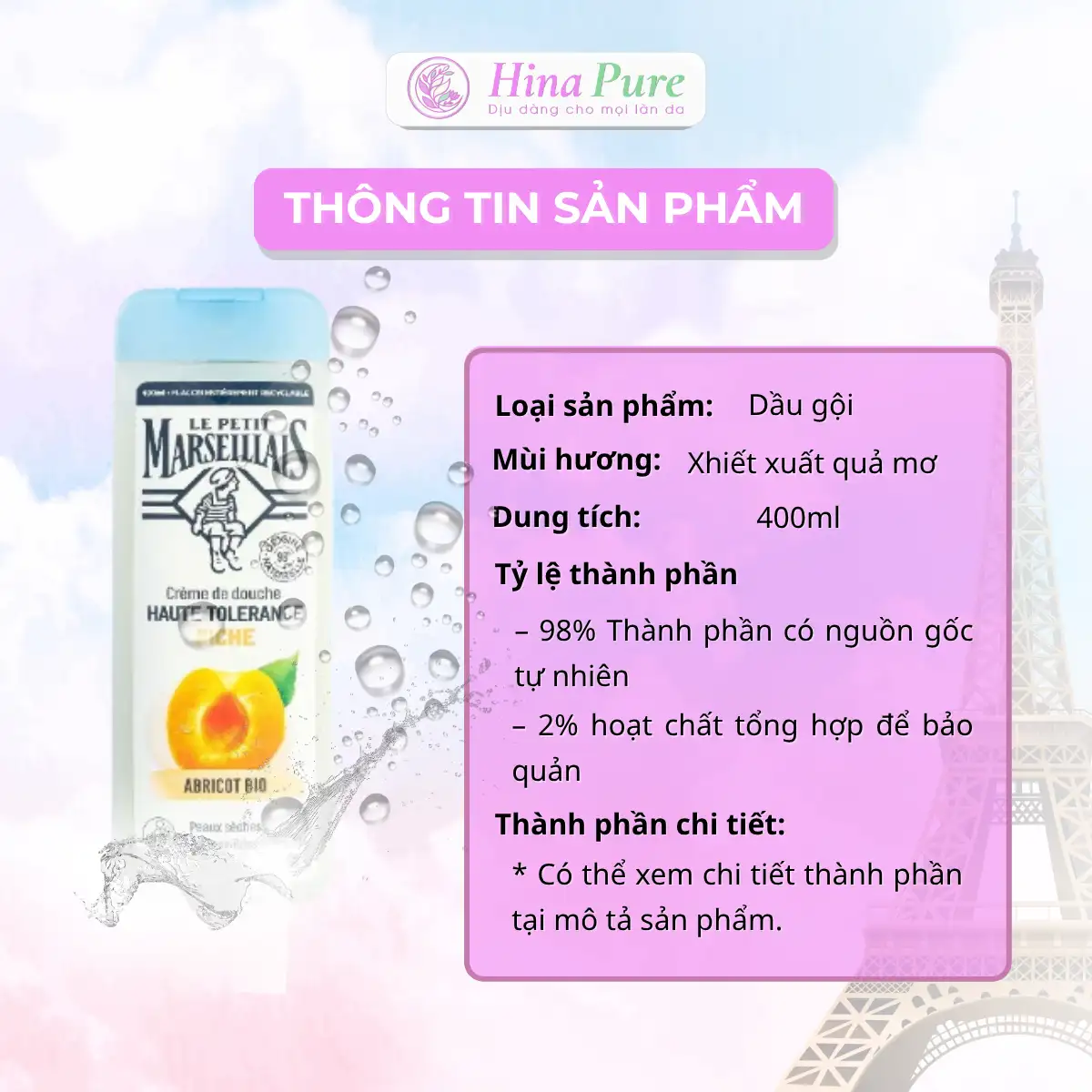 Nước (aqua), sodium cocoyl glutamate, glycerin, coco-glucoside, dầu hạt hướng dương (Helianthus annuus seed oil), axit citric (citric acid), natri benzoate (sodium benzoate), xanthan gum, hương liệu (fragrance), bột tảo đỏ (Chondrus crispus powder), chiết xuất quả mơ (Prunus armeniaca fruit extract)